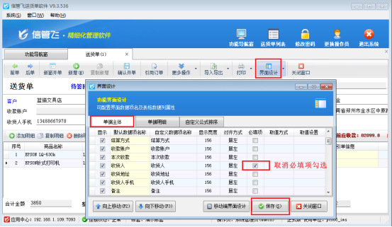 在送貨單開單界面—》界面設(shè)計(jì),單據(jù)主體,在必填項(xiàng)找到“收貨人”數(shù)據(jù)項(xiàng),把必填項(xiàng)的勾選符號去掉,然后保存,如圖2所示:
