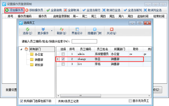 設(shè)置操作員登錄限制時,可以批量對多個操作員設(shè)置起始與結(jié)束時間。