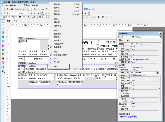 在開(kāi)單界面,點(diǎn)擊打印—》“打印格式設(shè)計(jì)”,在打印格式設(shè)計(jì)界面,選中需要修改的模板,點(diǎn)擊“設(shè)計(jì)格式”,可進(jìn)入模板設(shè)計(jì)器界面,選中細(xì)項(xiàng)數(shù)據(jù)處商品名稱文本框,鼠標(biāo)右鍵顯示出屬性,在屬性處找到“縮放字體類型”,選擇“rmstByWidth”屬性,如下圖所示: