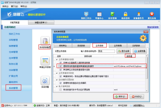 登錄軟件在功能導(dǎo)航窗點擊“系統(tǒng)管理”—》“系統(tǒng)參數(shù)配置”,業(yè)務(wù)參數(shù)勾選啟用“提取物流快遞數(shù)值到單據(jù)指定數(shù)據(jù)項”,參數(shù)值設(shè)置指定數(shù)據(jù)項:ext1=linkman,ext2=mobilephone,(擴展信息1取聯(lián)系人,擴展信息2取手機),保存配置,如下圖所示:
