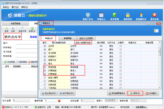 參數(shù)設(shè)置完成,“銷售管理”中打開銷售出庫單界面。點擊“界面設(shè)計”,單據(jù)主體中勾選“物流快遞、擴展信息1和擴展信息2”并上移至備注下邊,擴展信息1和擴展信息2修改自定義數(shù)據(jù)項名稱為“聯(lián)系人”和“電話”,如下圖所示: