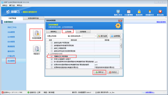 在功能導航窗點擊“系統管理”—》“系統參數設置”打開業務參數界面,啟用參數“可刪除已紅沖的單據”,然后保存參數設置。