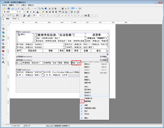 菜單欄點打印—》打印格式設(shè)計—》設(shè)計格式,進(jìn)入打印模板設(shè)計器界面,選中單價、金額明細(xì)欄,鼠標(biāo)右鍵勾選隱藏零值,勾選之后點擊保存。