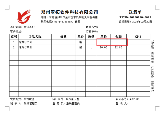 信管飛RMS軟件、信管飛倉庫管理軟件、信管飛送貨單軟件等支持自定義設(shè)計打印模板,送貨單軟件中自帶了十幾種打印模板樣式,部分用戶在設(shè)計模板時需要單據(jù)單價、金額為0時,模板中零值不顯示,以送貨單軟件為例設(shè)置下打印模板明細(xì)欄如何不顯示零值。未調(diào)整前打印模板顯示如下: