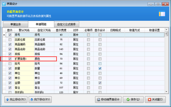 工具欄點擊“界面設計”—》“單據明細”,找到“自定義列名”為“顏色”的數據項,可查看“顏色”項的默認列名為“擴展信息1”。