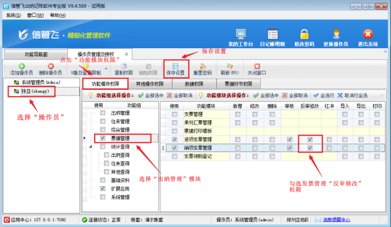 如果需要操作員反審修改發(fā)票,軟件也支持設(shè)置允許操作員反審修改發(fā)票權(quán)限,下面以信管飛出納記賬軟件專業(yè)版為例來演示一下設(shè)置操作員可反審修改發(fā)票權(quán)限操作步驟。