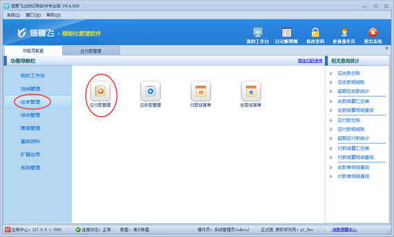在功能導(dǎo)航窗點擊“往來管理”—》“應(yīng)付款管理”打開應(yīng)付款管理界面,如下圖所示。