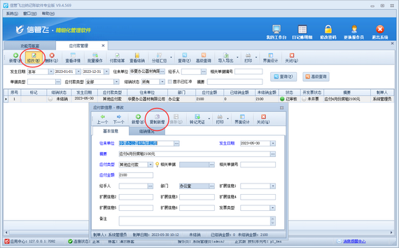 選擇需要被復(fù)制的房租應(yīng)付款信息,工具欄點擊“修改”按鈕,在打開的“修改應(yīng)付款信息”窗口點擊“復(fù)制新增”按鈕可復(fù)制生成一個一模一樣的應(yīng)付款信息,復(fù)制生成的新的應(yīng)付款信息需要修改后進(jìn)行保存,如下圖所示。