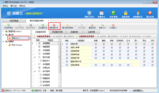 刪除操作員:選中已存在權(quán)限組下的操作員“李拓”,點擊“刪除操作員”按鈕。如下圖所示: