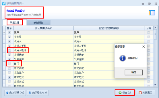 在移動(dòng)端界面設(shè)計(jì)界面,單據(jù)主體項(xiàng)中可取消勾選“收貨人電話(huà)”和“部門(mén)”選項(xiàng),然后保存界面設(shè)計(jì),如下圖所示: