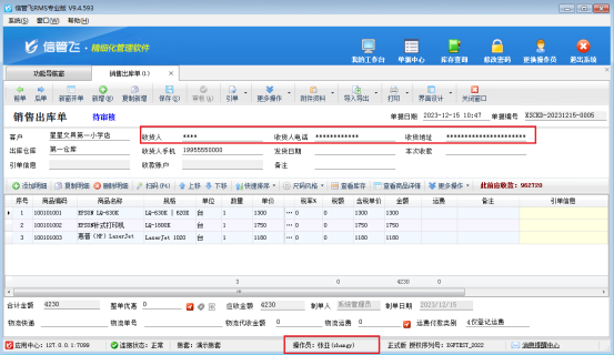 使用操作員賬號重新登錄軟件,可查看單據(jù)主體客戶收貨人、電話、地址等信息,如圖所示: