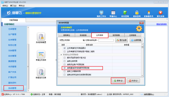 出現(xiàn)此問題的原因是:當(dāng)前登錄的操作員沒有查看客戶基礎(chǔ)資料權(quán)限,解決方法如下:使用系統(tǒng)管理員賬號登錄軟件,在功能導(dǎo)航窗點擊“系統(tǒng)管理”—》“系統(tǒng)參數(shù)配置”—》“業(yè)務(wù)參數(shù)”勾選參數(shù)“啟用基礎(chǔ)資料數(shù)據(jù)項權(quán)限控制”,如圖所示: