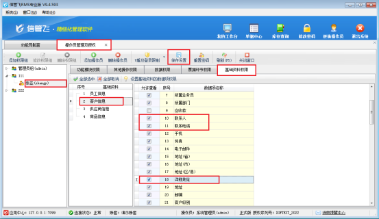 在功能導(dǎo)航窗點擊“系統(tǒng)管理”—》“操作員及授權(quán)”打開操作員管理及授權(quán)界面,選擇操作員賬號,在“基礎(chǔ)資料權(quán)限”界面將“客戶信息”權(quán)限勾選上聯(lián)系人、聯(lián)系電話、詳細(xì)地址等權(quán)限,然后保存權(quán)限設(shè)置,如圖所示: