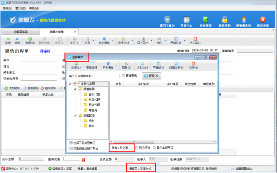 權(quán)限保存后,使用操作員再次登錄軟件,銷售出庫單開單界面選擇客戶信息界面可正常顯示客戶信息,如下圖所示: