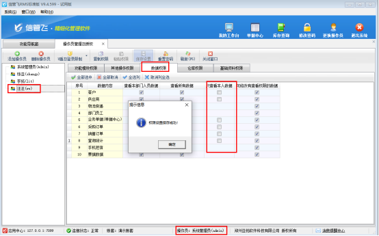 經(jīng)檢查,出現(xiàn)此問題是因為操作員權(quán)限設(shè)置的數(shù)據(jù)權(quán)限影響,在系統(tǒng)管理-操作員及授權(quán)界面。選擇此操作員,打開數(shù)據(jù)權(quán)限,把只查看本人數(shù)據(jù)權(quán)限取消勾選,然后保存操作員權(quán)限,如下圖所示: