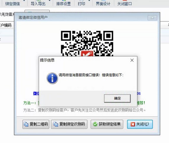 有用戶在進(jìn)行業(yè)務(wù)員和客戶綁定操作時(shí),綁定出錯(cuò),系統(tǒng)彈出提示信息“調(diào)用微信消息服務(wù)接口錯(cuò)誤!”如下圖所示。