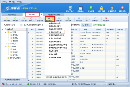 二、信管飛軟件的批量維護商品價格功能信管飛軟件作為一款專業的企業管理軟件,憑借其強大的功能和靈活的操作性,在市場中贏得了良好的口碑。其中,批量維護商品價格功能更是其一大亮點。在商品信息更多操作下點擊“批量維護商品信息”可進行批量修改操作,如下圖所示:
