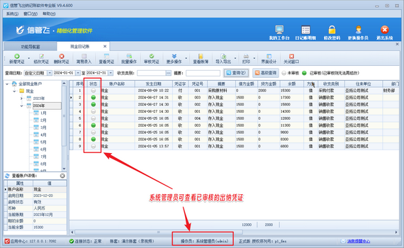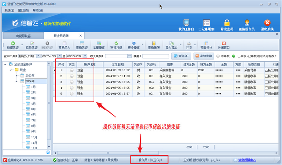 有用戶在使用信管飛出納記賬軟件時,系統管理員賬號登錄軟件可以查看已審核的出納日記賬憑證,但是操作員賬號登錄軟件無法查看已審核的出納日記賬憑證,如下圖所示。