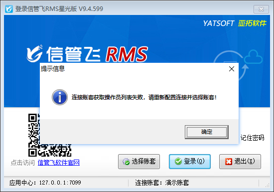 部分信管飛軟件用戶登錄軟件時(shí),提示“連接賬套獲取操作員列表失敗,請重新配置連接并選擇賬套!”,如下圖所示。