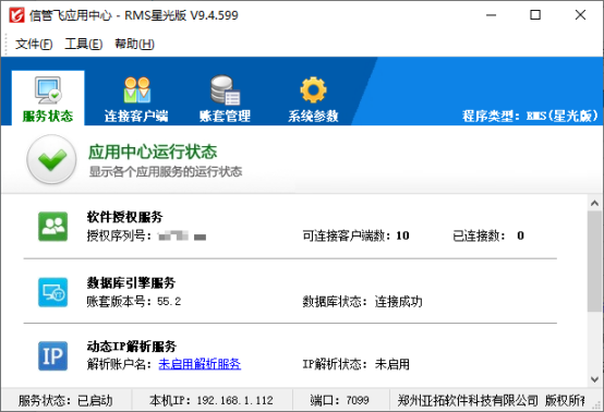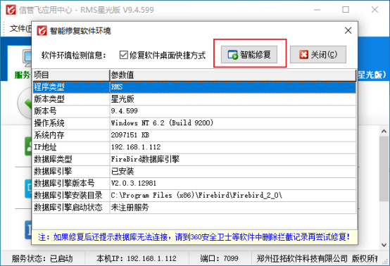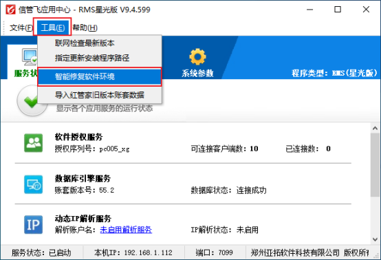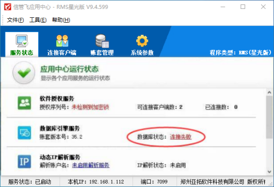 智能修復(fù)軟件環(huán)境完成后,請重啟應(yīng)用中心程序,然后查看下數(shù)據(jù)庫連接狀態(tài)是否顯示為連接成功(如下圖所示),數(shù)據(jù)庫狀態(tài)為連接成功,則軟件即可正常登錄。