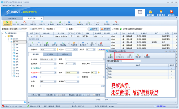 信管飛出納記賬軟件支持在日記賬憑證界面輸入核算項(xiàng)目,也支持按核算項(xiàng)目統(tǒng)計(jì),方便用戶(hù)統(tǒng)計(jì)不同項(xiàng)目的日記賬信息。有用戶(hù)在登記出納憑證時(shí),只能從已維護(hù)好的核算項(xiàng)目?jī)?nèi)容進(jìn)行選擇,而不能維護(hù)、新增核算項(xiàng)目?jī)?nèi)容,如下圖所示。