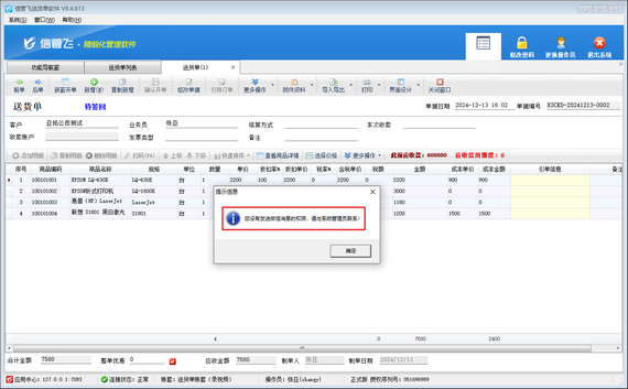 微信消息服務是信管飛軟件基于微信開放平臺研發的業務消息發送服務,支持即時推送業務單據消息,如訂單通知、發貨信息等。支持客戶查看消息詳情(可配置外部查看數據項)、單據簽收確認、分享轉發等功能。有用戶在填開單據后發送微信模板消息時,無法發送成功, 系統彈出提示信息“您沒有發送微信消息的權限,請與系統管理員聯系!”,如下圖所示。
