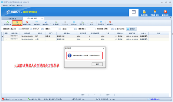 出現以上問題的原因是:當前登錄的操作員賬號沒有可修改其他人員創(chuàng)建的員工借款單權限。
