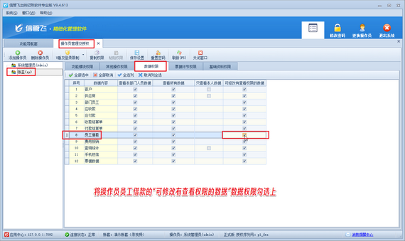 解決方法如下:使用系統(tǒng)管理員賬號登錄軟件,在功能導航窗點擊“系統(tǒng)管理”—》“操作員及授權”打開操作員管理及授權界面,選擇操作員賬號,在“數據權限”界面將員工借款“可修改有查看權限的數據”的權限勾選上,然后保存權限設置,如下圖所示。