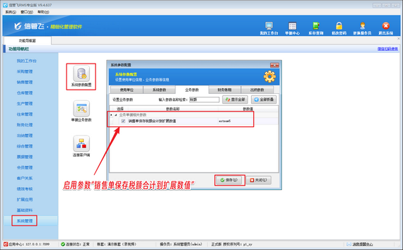 在軟件的功能導(dǎo)航窗中,用戶只需簡單幾步操作,即可啟用并配置“銷售單保存稅額合計到擴展數(shù)值”參數(shù)。系統(tǒng)默認將該稅額合計值保存到“extnum5(單據(jù)主體.擴展數(shù)值5)”中,但用戶也可以根據(jù)自身需求進行靈活設(shè)置。
