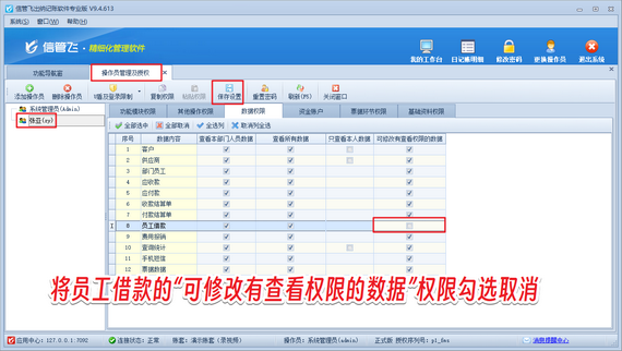 使用系統(tǒng)管理員賬號(hào)登錄軟件,在功能導(dǎo)航窗點(diǎn)擊“系統(tǒng)管理”—》“操作員及授權(quán)”打開(kāi)操作員管理及授權(quán)界面,選擇操作員賬號(hào),在“數(shù)據(jù)權(quán)限”界面將員工借款“可修改有查看權(quán)限的數(shù)據(jù)”的權(quán)限勾選取消,然后保存權(quán)限設(shè)置,如下圖所示。