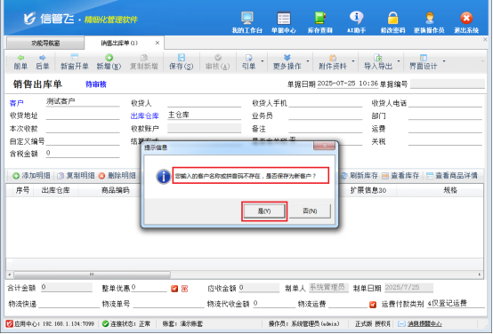 配置保存后,重新打開(kāi)銷售出庫(kù)單,此時(shí)開(kāi)單界面即可正常添加新客戶。