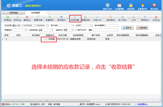 選擇應(yīng)收款并進(jìn)行結(jié)算:在應(yīng)收款列表中,選擇一條未結(jié)銷的應(yīng)收款,點(diǎn)擊工具欄的“收款結(jié)算”按鈕,系統(tǒng)將迅速彈出收款結(jié)算單界面。