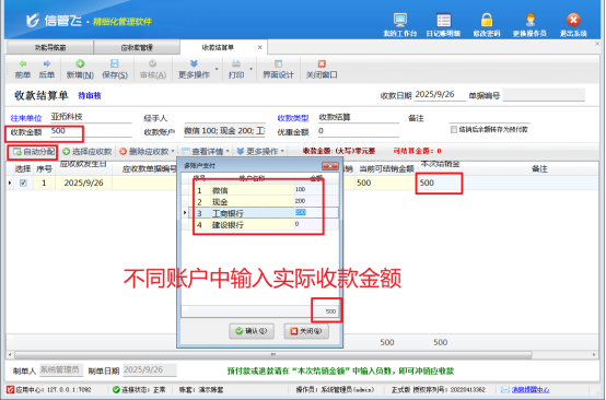 多賬戶輸入與自動分配:在收款結(jié)算單界面,打開收款賬戶選項(xiàng)。在多資金賬戶中分別輸入實(shí)際收款金額。只需確保多個賬戶的收款金額相加等于本筆應(yīng)收款金額,軟件便會自動進(jìn)行分配,無需您手動計(jì)算與調(diào)整,大大提高了結(jié)算的準(zhǔn)確性與效率。