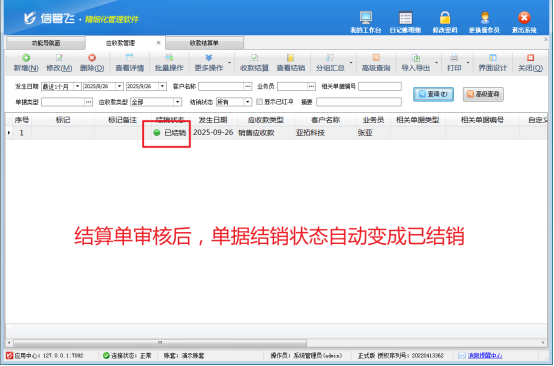 審核完成后,系統(tǒng)會自動將此筆應(yīng)收款在應(yīng)收款管理中的結(jié)銷狀態(tài)變更為“已結(jié)銷”。可以隨時在應(yīng)收款管理界面查看每筆款項(xiàng)的結(jié)算狀態(tài),實(shí)時掌握企業(yè)資金動態(tài),為財(cái)務(wù)決策提供有力支持。