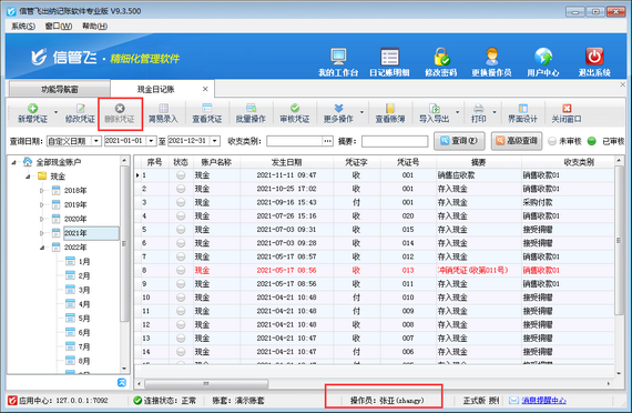 出納記賬軟件支持登記現(xiàn)金(銀行)日記賬,已保存的日記賬如有填寫錯誤,支持刪除,已審核的出納日記賬需反審后可進(jìn)行刪除操作,本篇文章介紹一下如何設(shè)置操作員賬號不可刪除出納日記賬。 登錄軟件,在功能導(dǎo)航窗點擊“系統(tǒng)管理”—》“操作員及授權(quán)”,進(jìn)入“操作員管理及授權(quán)”界面,選擇操作員“張亞”,在其右側(cè)的功能模塊權(quán)限內(nèi)選擇“出納管理”