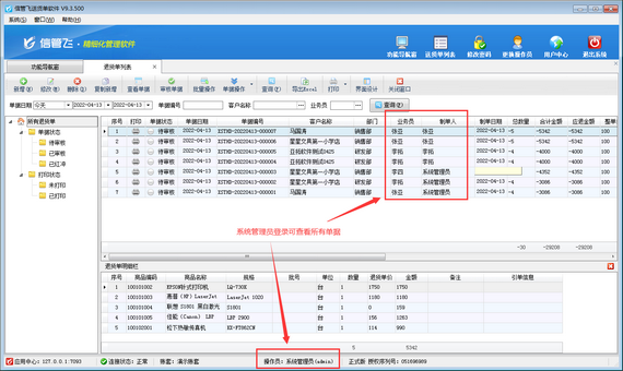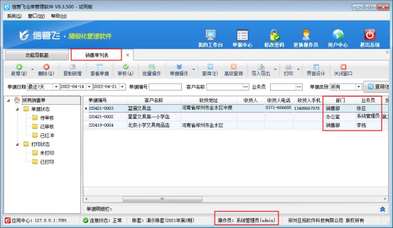 信管飛倉庫管理軟件、信管飛送貨單軟件、信管飛RMS軟件,都支持設(shè)置多個操作員并對操作員進(jìn)行權(quán)限控制,通過設(shè)置操作員的“數(shù)據(jù)權(quán)限”,可以更精細(xì)的控制操作員對業(yè)務(wù)單據(jù)的查看權(quán)限。有用戶需要操作員只能查看本部門人員單據(jù),以“信管飛倉庫管理軟件”為例,示范下如何操作? 示例:操作員“系統(tǒng)管理員”和操作員“張亞