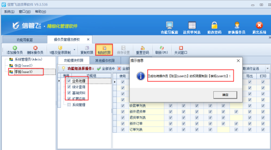 信管飛送貨單軟件、信管飛RMS軟件等都支持新增多個操作員并根據操作員設置不同的權限,當新增員工時,需要此員工添加為操作員且操作權限需要和之前員工一致,軟件支持快速復制已有操作員的權限,本文以“信管飛送貨單軟件”進行示范下。 新增操作員“李拓”,在“基礎資料”—》“員工信息”中先添加姓名為“李拓”的員工