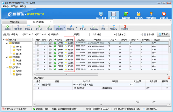會計憑證是指記錄經濟業務發生或完成情況的書面證明,包括原始憑證和記賬憑證,是登記賬簿的依據。會計憑證是記錄經濟信息的載體;信管飛RMS專業版包含財務處理功能(使用賬務處理功能需要操作員具有一定的專業財務知識),可用來登記會計憑證。 軟件內的做賬流程為:憑證輸入—憑證審核—憑證過賬—結轉損益—期末結賬,結賬后賬期自動進入下一賬