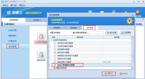 信管飛送貨單軟件支持設(shè)置商品擴展數(shù)值提取到單據(jù)擴展數(shù)值,啟用此參數(shù)后,在開單據(jù)時系統(tǒng)會自動調(diào)取商品信息中的擴展數(shù)值數(shù)據(jù),省去了每次開單錄入單據(jù)擴展數(shù)值的時間,提高了開單效率。下面我們介紹一下具體的操作步驟。 在功能導(dǎo)航窗點擊“系統(tǒng)管理”—》“系統(tǒng)參數(shù)配置”—》“業(yè)務(wù)參數(shù)”打開業(yè)務(wù)參數(shù)配置界面,在“業(yè)務(wù)單據(jù)明細參數(shù)”內(nèi)啟用參數(shù)