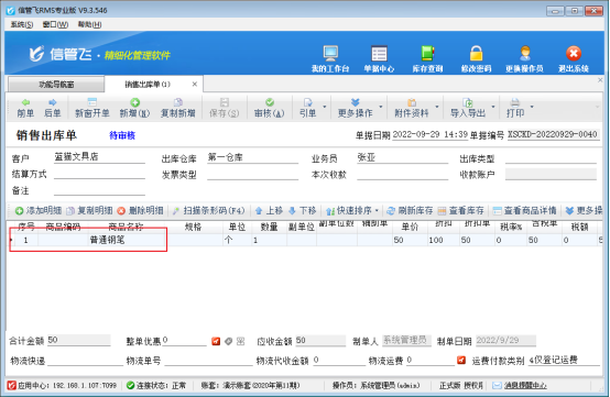 此文章相關(guān)演示視頻:如何設(shè)置新開送貨單時添加商品后自動增加新行演示視頻 信管飛RMS軟件、信管飛倉庫管理軟件、信管飛送貨單軟件等都支持開單直接添加商品明細,部分用戶在剛開始使用軟件時,開單添加一個商品后,不清楚如何在單據(jù)明細內(nèi)繼續(xù)增加新的商品信息,如下圖所示,此問題在鍵盤上面按方向下鍵即可在單據(jù)明細中