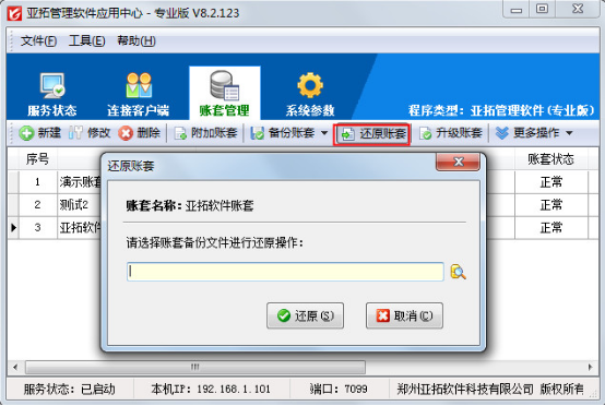 亞拓管理軟件、亞拓倉庫管理軟件中都含有賬套管理功能,賬套管理實現賬套數據庫的集中管理,包括新建賬套、修改賬套屬性、刪除賬套、附加賬套、備份賬套、還原賬套和升級賬套等功能。下面我們以亞拓管理軟件為例來演示一下賬套管理中各個功能具體的操作方法。 打開亞拓管理軟件應用中心(桌面右下角紅色的圖標)—》“賬套管理”即可進入賬套管理界面