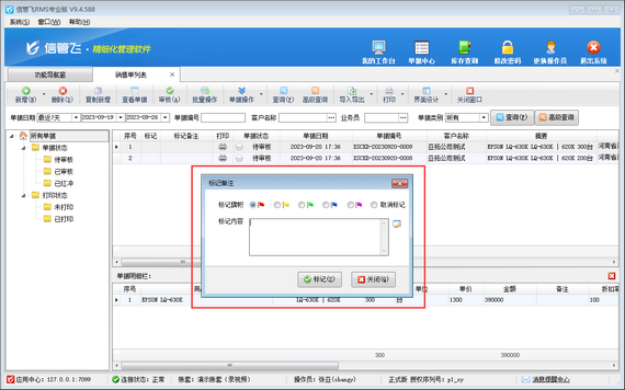 信管飛RMS支持對(duì)銷售單列表、采購單列表、銷售訂單列表以及采購訂單列表等標(biāo)記備注,有用戶在標(biāo)記單據(jù)備注時(shí)無法標(biāo)記,系統(tǒng)彈出提示信息“您沒有標(biāo)記備注的權(quán)限,請(qǐng)與系統(tǒng)管理員聯(lián)系!”如下圖所示: 演示視頻觀看鏈接:操作員不可標(biāo)記單據(jù)備注,如何解決演示視頻 出現(xiàn)此問題的原因是:當(dāng)前登錄的操作員賬號(hào)