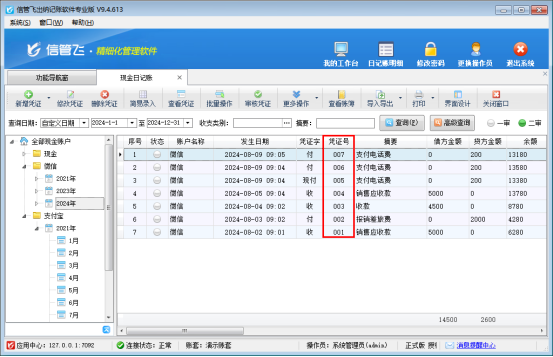 憑證號(hào)是出納憑證的重要標(biāo)識(shí),它記錄了每一筆經(jīng)濟(jì)業(yè)務(wù)的唯一性,對(duì)于后續(xù)的賬務(wù)查詢分析至關(guān)重要。然而,在實(shí)際操作過(guò)程中,由于人為錯(cuò)誤或系統(tǒng)調(diào)整等原因,可能會(huì)出現(xiàn)憑證號(hào)斷號(hào)的情況,這不僅影響了賬目的美觀性,還可能給后續(xù)的統(tǒng)計(jì)帶來(lái)困擾。信管飛出納軟件的日記賬檢查憑證號(hào)斷號(hào)功能,正是為了解決這一問(wèn)題而生。問(wèn)題如下圖所示: &