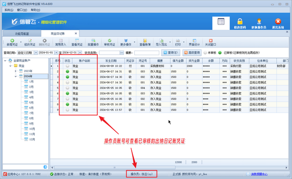 有用戶在使用信管飛出納記賬軟件時(shí),系統(tǒng)管理員賬號(hào)登錄軟件可以查看已審核的出納日記賬憑證,但是操作員賬號(hào)登錄軟件無(wú)法查看已審核的出納日記賬憑證,如下圖所示。 演示視頻觀看鏈接:操作員不可查看已審核的出納日記賬憑證,如何解決演示視頻 出現(xiàn)以上問(wèn)題的原因是:操作員賬號(hào)沒(méi)有查看已審核的出納日記賬憑