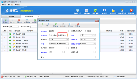 許多用戶在使用軟件記賬時都會問到一個問題:如何新增現金賬戶和銀行賬戶?本節我們以信管飛RMS專業版來介紹一下進銷存軟件內如何新增資金賬戶? 在功能導航窗點擊“基礎資料”—“資金賬戶”打開資金賬戶信息界面,點擊工具欄中的“新增”按鈕,在彈出的“資金賬戶—新增”窗口錄入賬戶名稱、勾選賬戶類型“現金賬戶”、