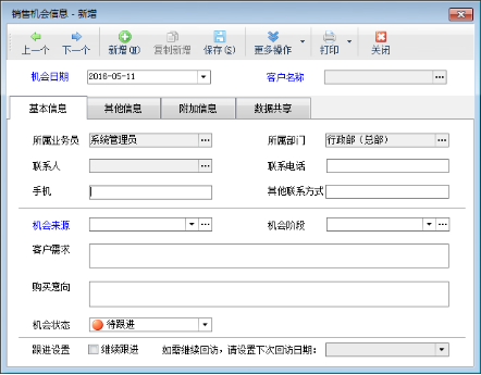 銷售機會即銷售線索,用于管理從各種途徑搜集過來的銷售業(yè)務(wù)信息(如客戶需求、購買意向、招投標信息等)。對銷售機會可以進行跟蹤回訪,進而促成實際銷售(簽訂合同、銷售發(fā)貨)。 銷售機會管理是屬于客戶關(guān)系管理模塊,客戶關(guān)系管理模塊是屬于擴展模塊,只有在亞拓管理軟件標準版和專業(yè)版中才能使用,下面我們來演示一下具體的操作步驟。