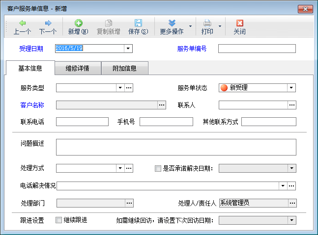 客戶服務(wù)管理即售后維修管理、技術(shù)支持管理、投訴反饋管理,亞拓管理軟件支持流程化的客戶服務(wù)管理,包括受理、分派、服務(wù)完工、跟蹤回訪等完整客服流程管理。對于維修性質(zhì)的服務(wù),軟件支持管理返修產(chǎn)品信息(故障產(chǎn)品名稱、批號、序列號、質(zhì)保情況等)和維修費用,并可支持多達10個擴展數(shù)據(jù)項。 在功能導(dǎo)航窗,點“客戶關(guān)系”—》“客戶服務(wù)管理”