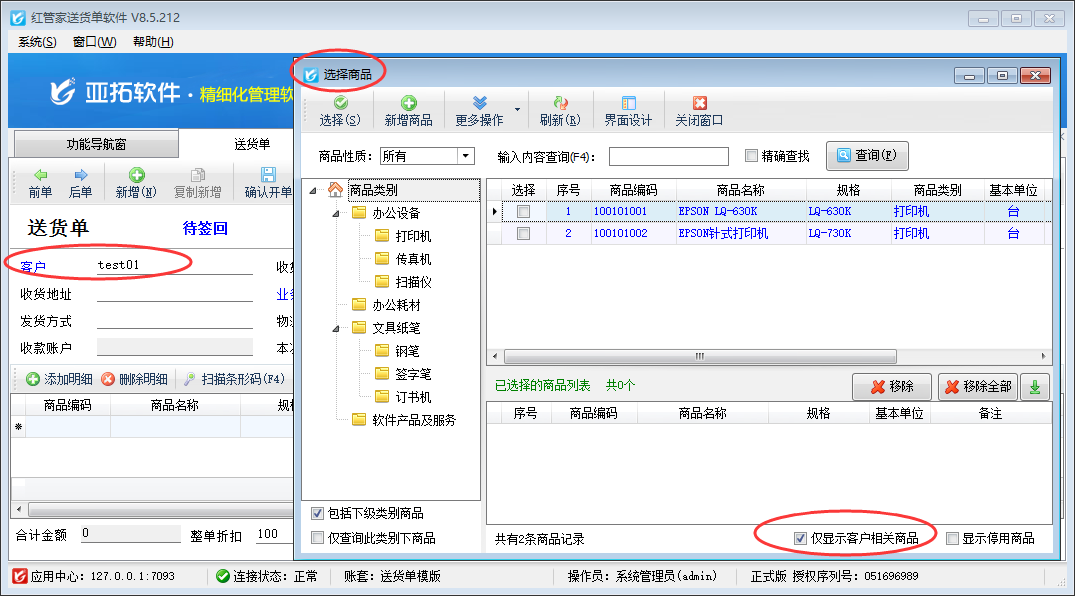 亞拓管理軟件、紅管家倉庫管理軟件和紅管家送貨單軟件開單時都支持選擇系統(tǒng)內(nèi)已錄入的商品信息,進行快速選擇商品來開單。選擇商品時在選擇商品窗口默認是可以顯示所有商品(圖一),但是部分用戶在選擇商品時只需要顯示此客戶相關(guān)的商品,如何設置呢?本篇文章我們以紅管家送貨單軟件為例來詳細介紹一下如何設置在選擇商品窗口僅顯示客戶相關(guān)商品?圖一 新開送貨單