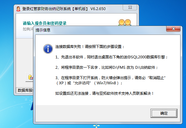 近期接到不少客戶反饋,以前使用的是Windows XP操作系統(tǒng),由于微軟停止XP技術(shù)支持更新,機(jī)器安裝成Windows7或Windows 8操作系統(tǒng)后,登錄紅管家財(cái)務(wù)出納記賬軟件的時(shí)候提示無(wú)法連接數(shù)據(jù)庫(kù)的錯(cuò)誤提示,如下圖所示: 出現(xiàn)這種問題的原因是:Windows 7/Windows 8操作系統(tǒng)的默認(rèn)賬戶雖然是管理員賬戶,但在很大程度上對(duì)于一部分系