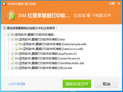 亞拓軟件所有軟件產(chǎn)品在升級(jí)的時(shí)候,都不需要先卸載原來(lái)的程序,可以直接安裝新版本即可,不會(huì)覆蓋原有的數(shù)據(jù)。部分用戶可能有先卸載然后再安裝的習(xí)慣,這個(gè)時(shí)候需要注意,安裝了360安全衛(wèi)士的用戶,可能在卸載軟件后會(huì)提示是否刪除殘留文件,如下圖所示: 請(qǐng)務(wù)必不要?jiǎng)h除,因?yàn)檐浖遁d程序沒有刪除的文件為賬套數(shù)據(jù)庫(kù)文件和程序配置文件,這些數(shù)